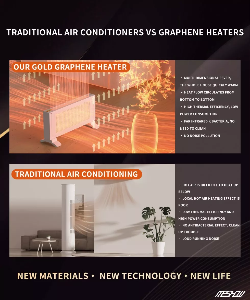Meshow yüksək keyfiyyətli qara portativ uzaq infraqırmızı qrafen qızdırıcılarının dizaynına və istehsalına yönəlmişdir. Milli bazar üçün birdən çox xüsusi məhsulu işə salın. Qızdırıcılarımız yalnız enerji qənaət və ekoloji cəhətdən təmiz deyil, həm də şık bir görünüş və əla performansa malikdir.
